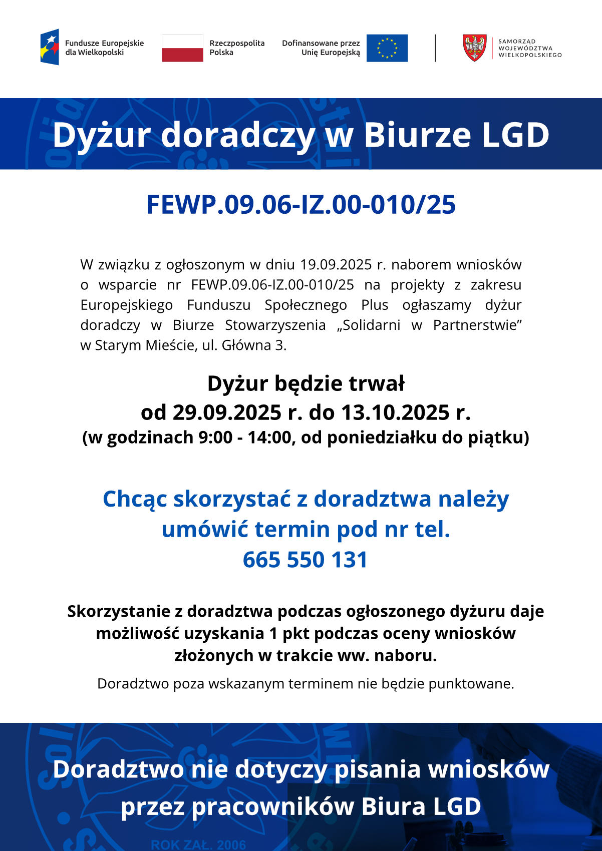 Stowarzyszenie „Solidarni w Partnerstwie” w związku z ogłoszonym naborem FEWP.09.06-IZ.00-010/25 w ramach Programu Fundusze Europejskie dla Wielkopolski na lata 2021-2027, którego Instytucją Zarządzającą jest Zarząd Województwa Wielkopolskiego zaprasza na doradztwo.